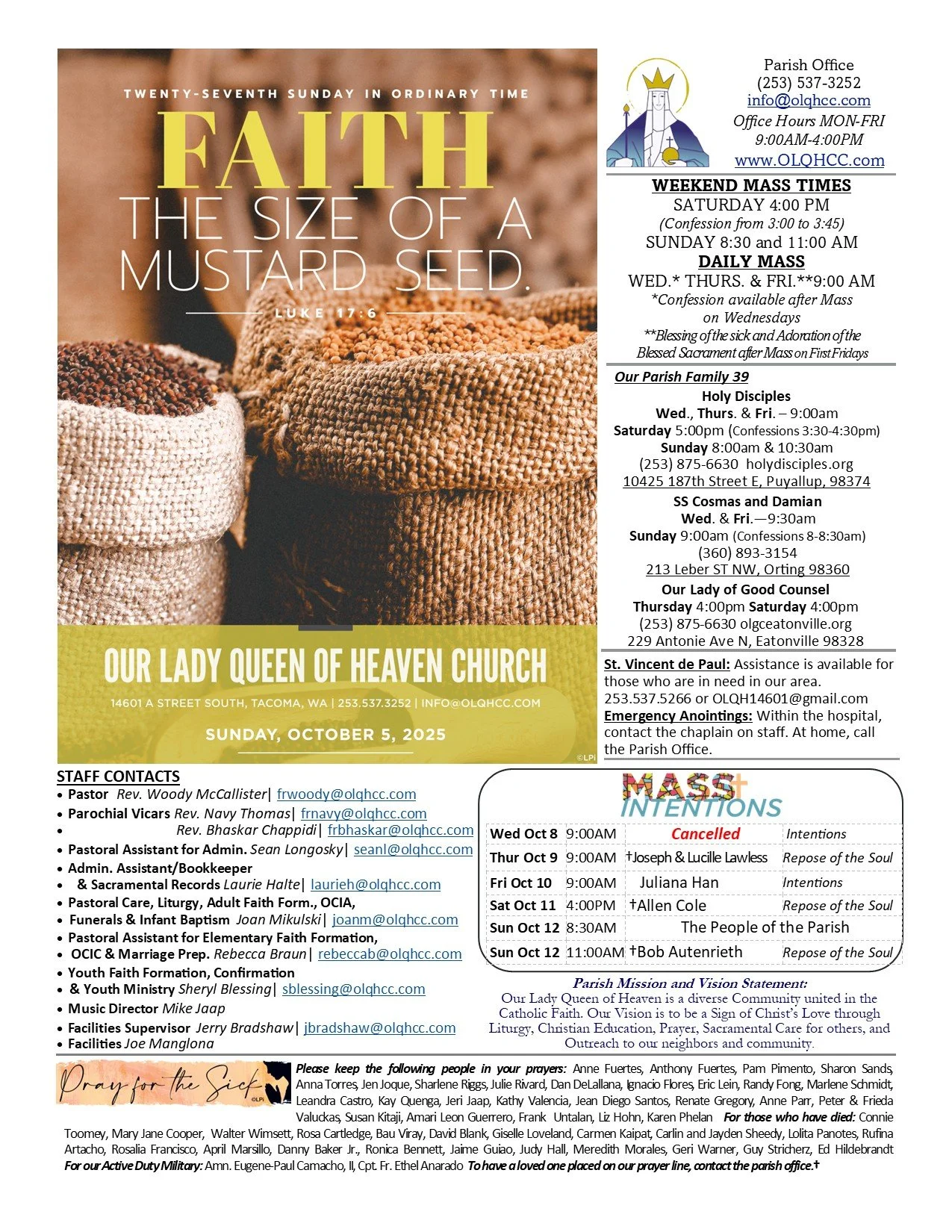 October 5, 2025 - Twenty-Seventh Sunday in Ordinary Time Oct 4 Written By Administrator Click here for PDF Version of the Bulletin . Administrator