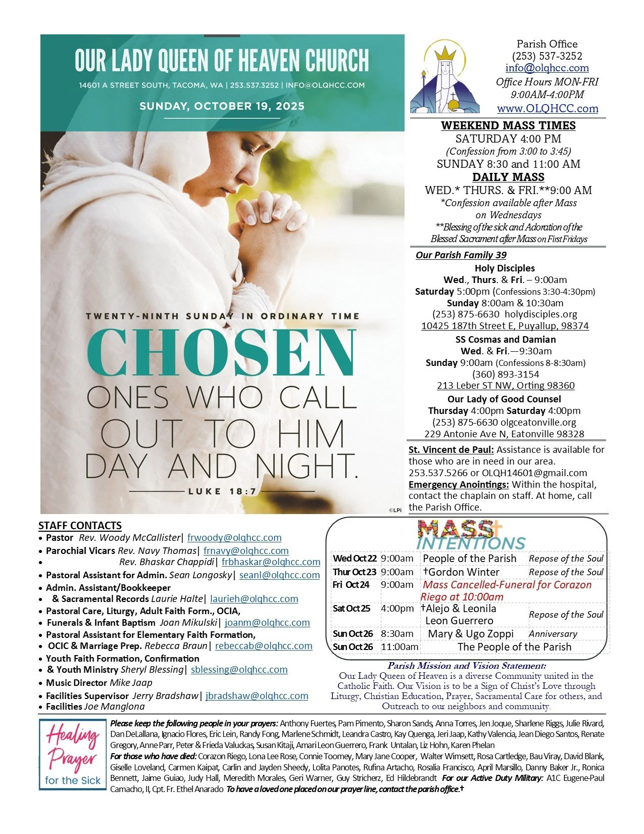October 19, 2025 - Twenty-Ninth Sunday in Ordinary Time Oct 17 Written By Administrator Click here for PDF Version of the Bulletin . Administrator